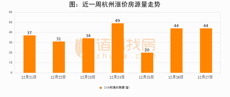根据诸葛找房数据显示,杭州24小时涨价房源量为44套,较12月26日持平。