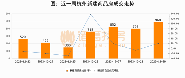 根据杭州市住房保障和房产管理局数据显示,2023年12月29日杭州新建商品房成交968套,较昨日增加170套,环比上涨21.3%