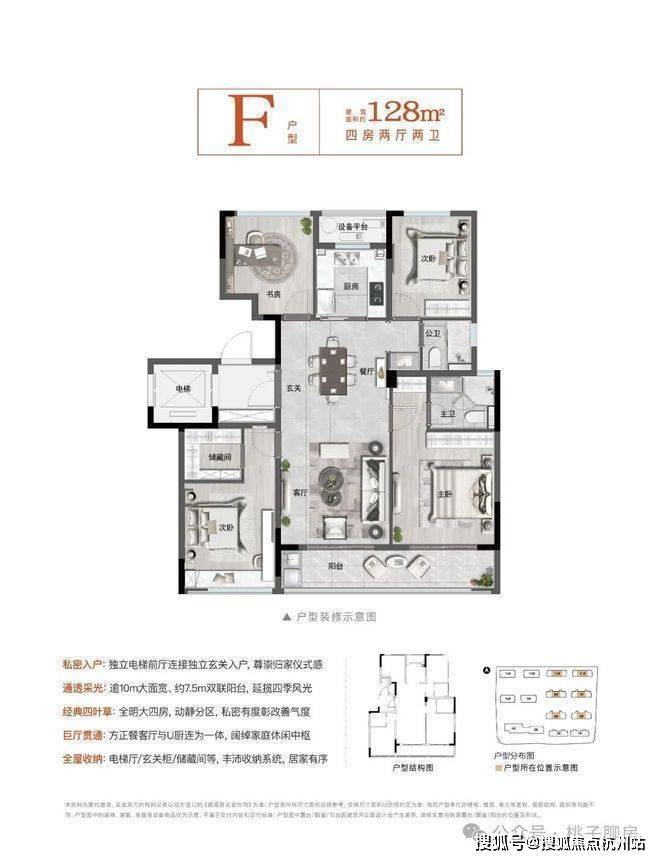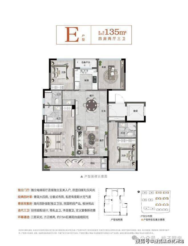 <臻贵> 祗此 140㎡内双套房:得房率超83%,带来超乎想象的尺度感,富春罕见,其中140㎡内户型,“1梯入户+2套房+3卫+大4房”尊崇设计,赶超市场165㎡