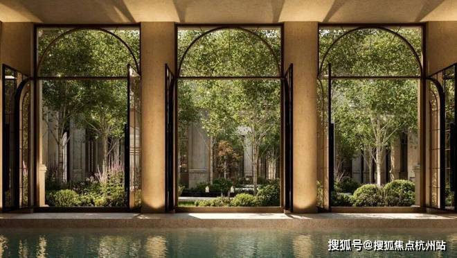 NO.8花园泳池波光潋滟处,拱形门窗外花影摇曳,一池春水将四季芳菲溶成流动的油画.