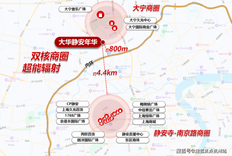 而大华静安年华,正落子 大宁板块更靠近内环的黄金C位 ,以 约800米直抵内环的稀缺站位,独享双核商圈超能辐射 。(距离来源百度地图)