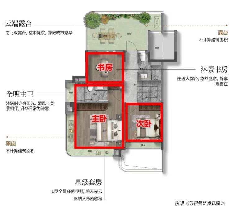 主卧更别出心裁地设计了两大270°转角飘窗,在同面积段产品中实属罕见,瞬间将睡眠区的景观层次与奢华感拉升到新的高度。