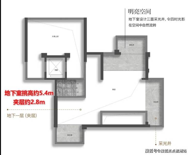 此户型的另一核心价值点,在于其约5.4米挑高的地下室空间。配合采光井的设计(地下室面积约125㎡),有效解决了传统地下室昏暗潮湿的痛点,将其变为一个可自由定义的功能场域。无论是打造为私人藏酒阁、专业级视听室,还是禅意茶室,皆能随心所愿。