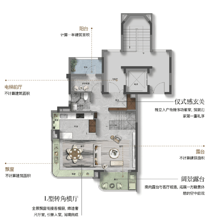如果说112㎡户型是平面空间的极致利用,那么约144㎡的上叠户型则开启了垂直生活的无限遐想。其建筑面积约144㎡,但通过巧妙的挑空、露台及灵动空间设计,实际可使用面积高达约180㎡,实得率约125%,价值感瞬间拉满。