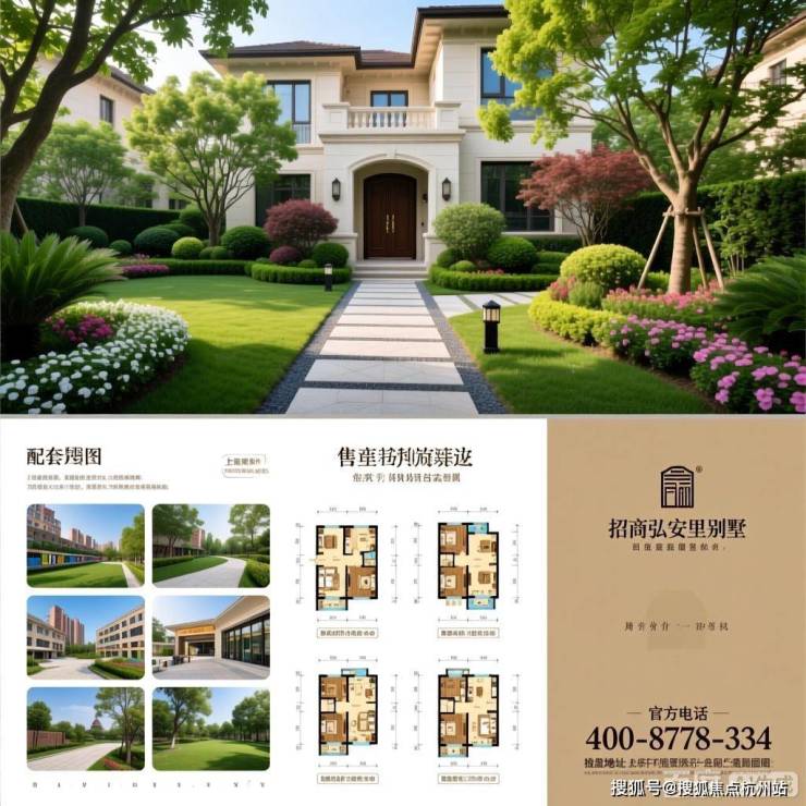 上海虹口区招商弘安里别墅,包含地址、电话、户型图、房价、沙盘图、区位图、样板间、配套图、实景图等关键元素,风格统一为专业、清晰的房产广告风格,突出楼盘品质与优势。