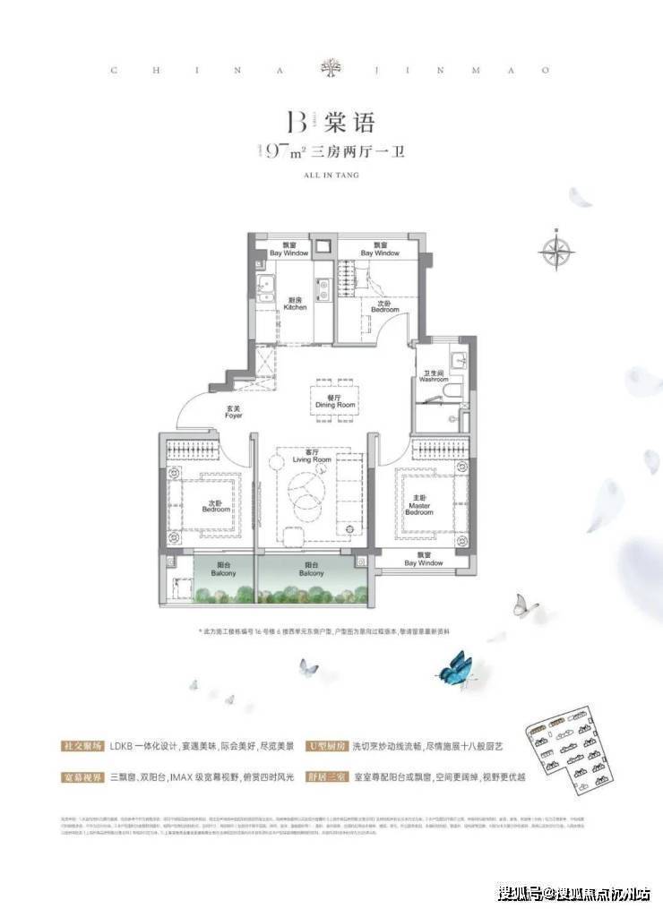 建面约97㎡3房2厅1卫 ,户型 三开间朝南、再加上“3个飘窗+双面阳台系统” ,不管是采光、视野、通风、私密性,还是实用性都十分出色。