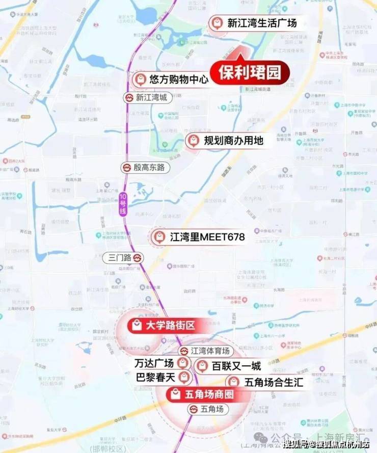 项目周边汇聚五大商业体,距离项目200m就是新江湾生活广场,约1km就是悠方购物广场,约2km是江湾里MEET678,约3km是大学路街区,3站地铁就可以直达五角场商圈:合生汇、万达广场、百联,可以满足日常所需,实现了居住与通勤的平衡。
