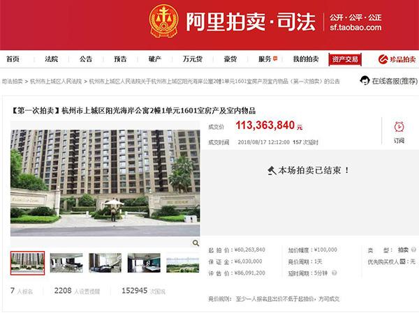 淘宝司法网拍平台:杭州最贵法拍商品房成交,总价1.13亿