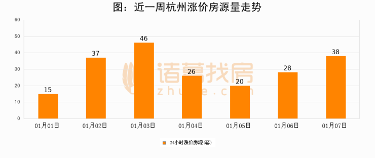 根据诸葛找房数据显示,杭州24小时涨价房源量为38套,较01月06日增加10套,环比上涨35.7%。与此同时,涨价房源占比小幅扩大,业主信心有所提升。