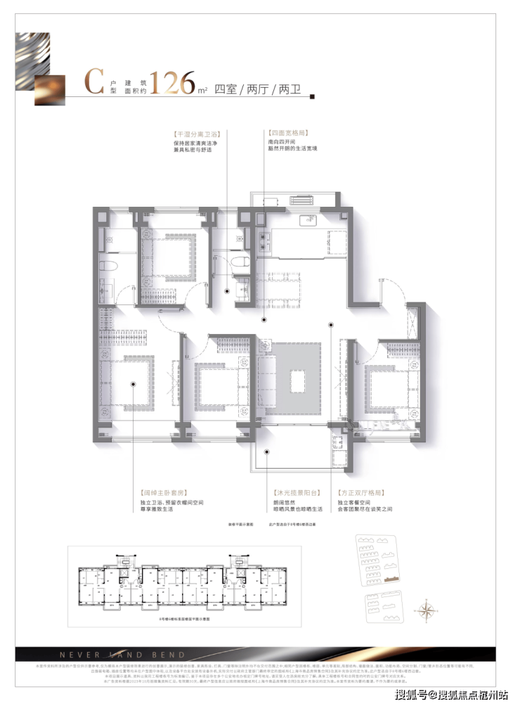 建面约126㎡真四房, 进一步强化功能性,户型方正,四开间朝南,南北通透,南向卧室均带有大飘窗设计,拓宽了室内景观视野的同时,增加了实际空间使用率,有效避免面积浪费。