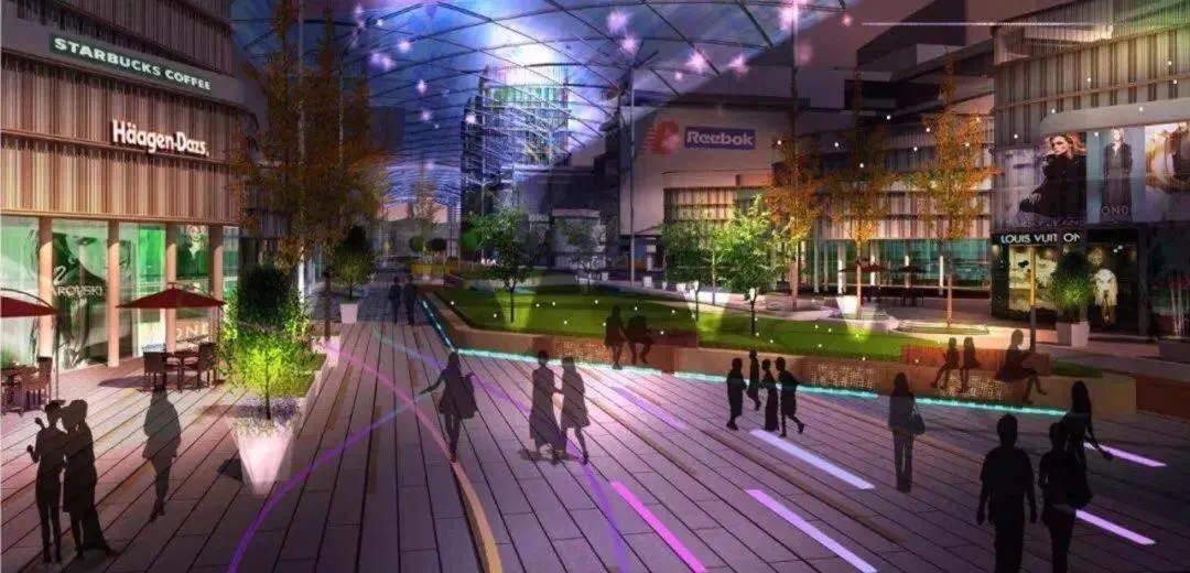 比如,除了已有海量商业外, 1公里长的“十字天幕街”,就在花语天境北面。计划2022年前建成,未来家门口就有一条毗美湖滨的步行街。