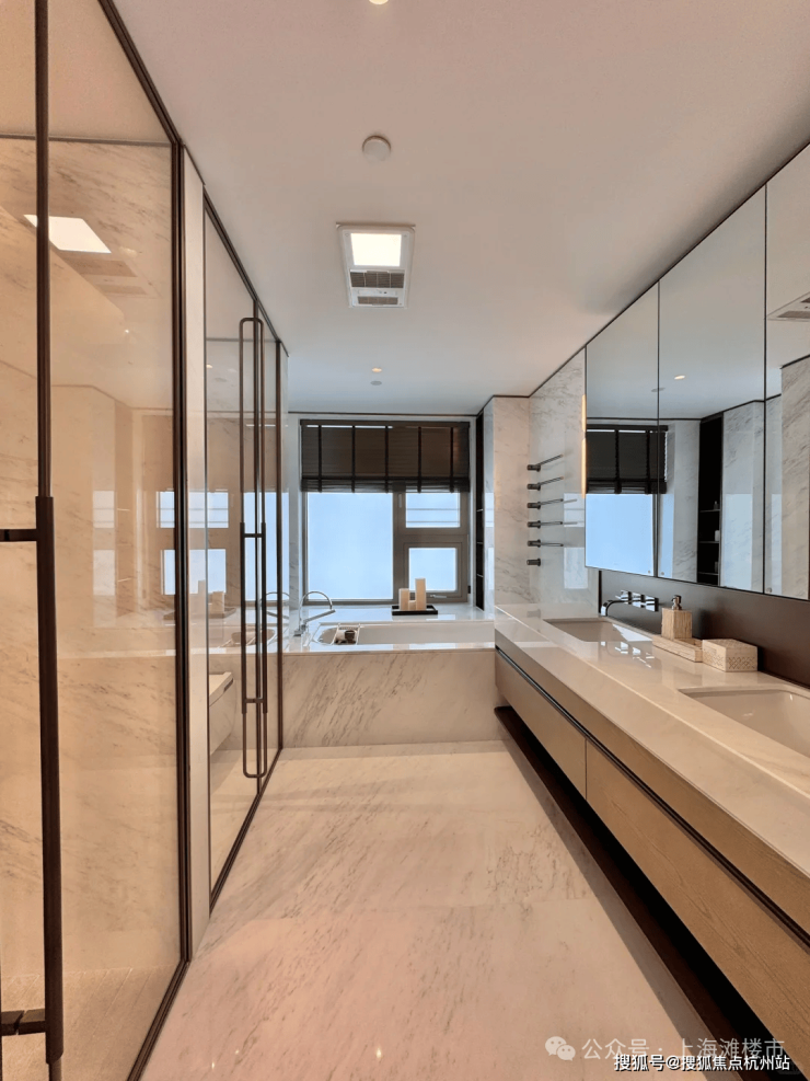 厨卫方面,西厨定制高柜,容纳嘉格纳蒸烤一体机、嘉格纳双开门冰箱、洗手台以及各类收纳空间;中厨自带嘉格纳灶具、油烟机和洗碗机。主卫配置劳芬台盆、浴缸和独立卫浴洁具空间、独立淋浴空间配备当代的花洒,顶部有松下暖风机,还配置了电热毛巾架。