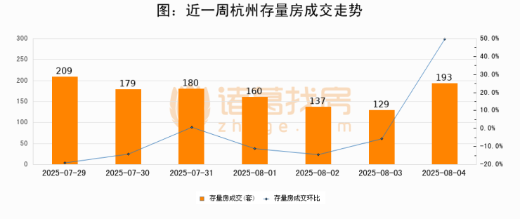 从存量房来看,2025年08月04日杭州存量房单日成交193套,比昨日增加64套,环比上涨49.6%。从近一周存量房成交来看,杭州存量房日均成交套数为169套,08月04日单日成交193套,高于近一周平均水平14.2%。