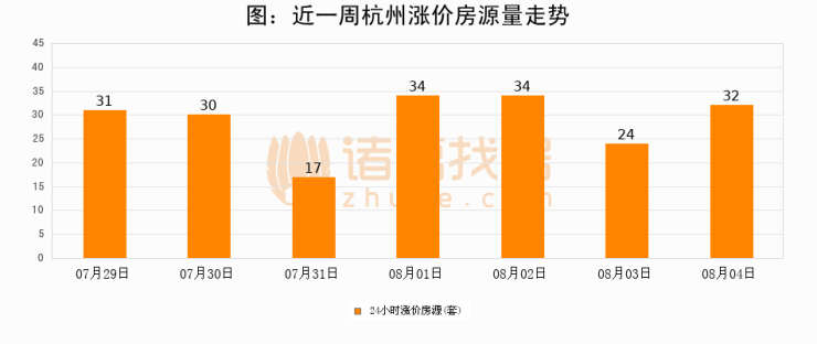 根据诸葛找房数据显示,杭州24小时涨价房源量为32套,较08月03日增加8套,环比上涨33.3%。与此同时,涨价房源占比小幅扩大,业主信心有所提升。