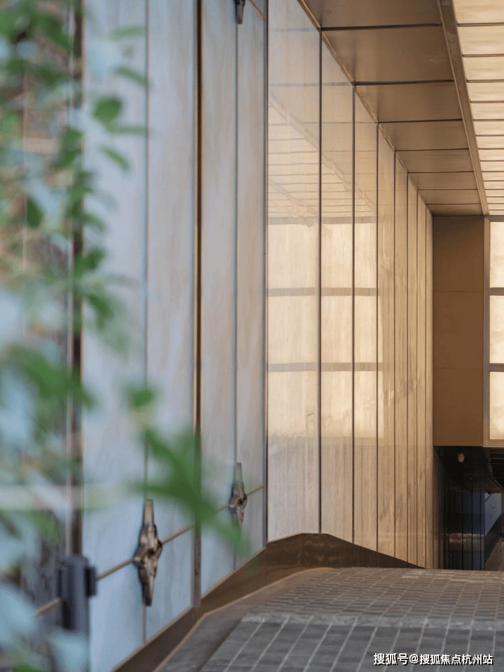 往里走,入口坡道的顶面,以纤细的 金属线条 勾勒出秩序的骨架,内嵌的 透光云石玻璃 , 于细节处营造上海高端小区车库范本。