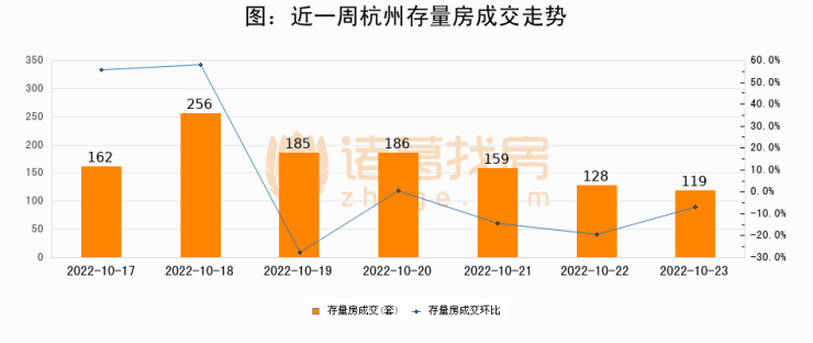 从存量房来看,2022年10月23日杭州存量房单日成交119套,比昨日减少9套,环比下降7%。从近一周存量房成交来看,杭州存量房日均成交套数为170套,其中10月18日成交量较高为256套,10月23日单日成交119套,低于近一周平均水平30%。