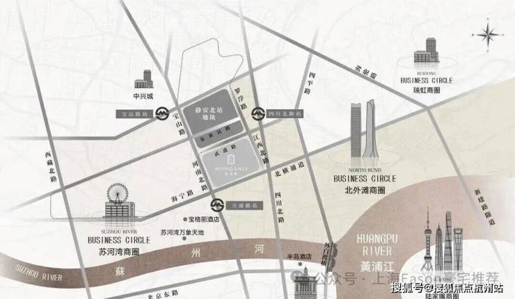 仅从图上看,该地块直线距苏州河约1公里,直线距外滩约1.4公里,直线距北外滩约1.7公里,直线距3/4号线宝山路站约300米,直线距10号线四川北路站约560米,区位优势明显。