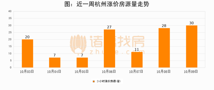根据诸葛找房数据显示,杭州24小时涨价房源量为30套,较10月08日增加2套,环比上涨7.1%。与此同时,涨价房源占比小幅扩大,业主信心有所提升。