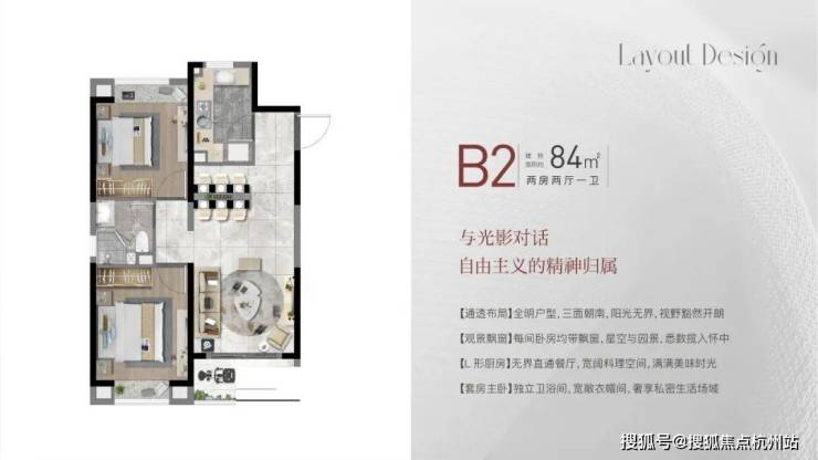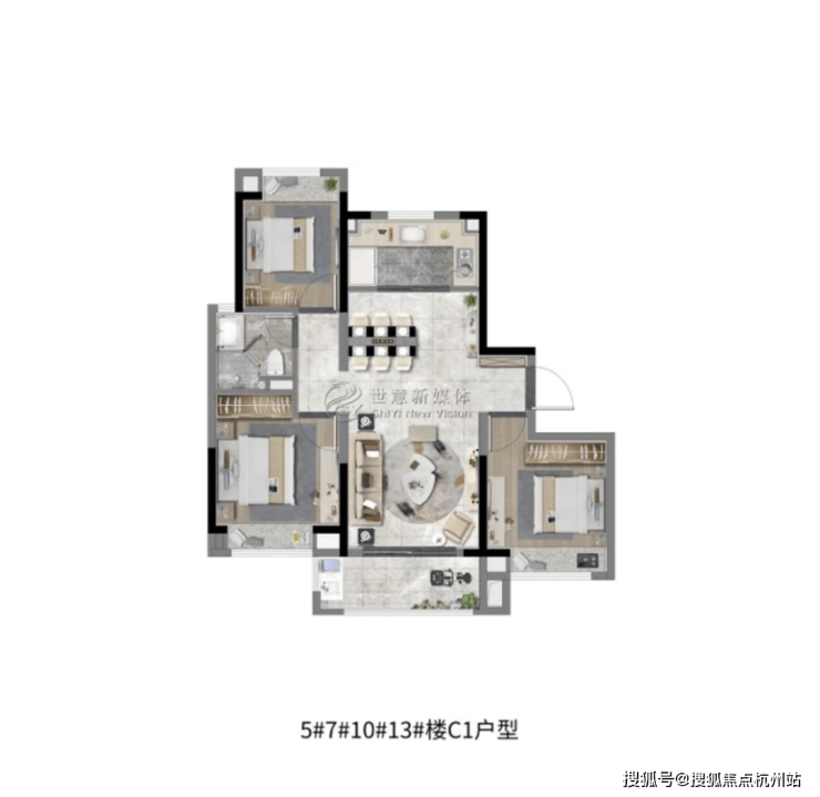 建面约108㎡3房2厅2卫,做到了三开间朝南+双阳台设计+主卧套房设计+南北通透,该户型得房率非常高。
