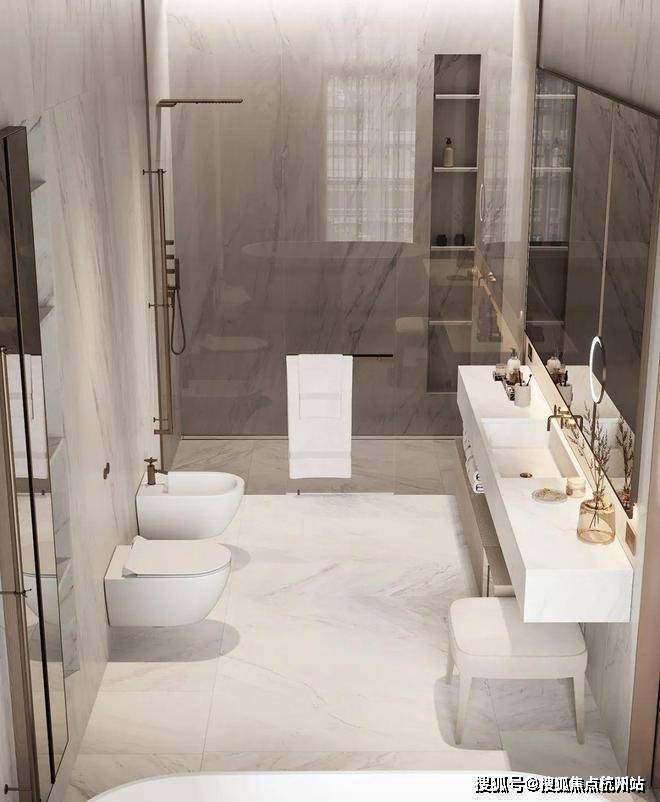 The bathroom expresses the cleanliness of the space through bright light, and the white marble sets off the cleanness and purity of the space, showing a sense of high quality.
