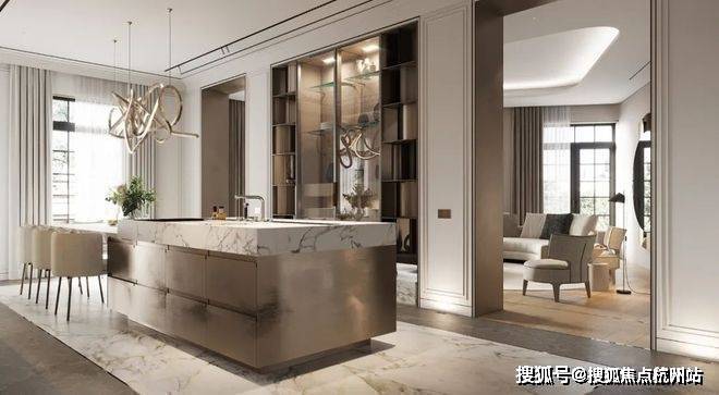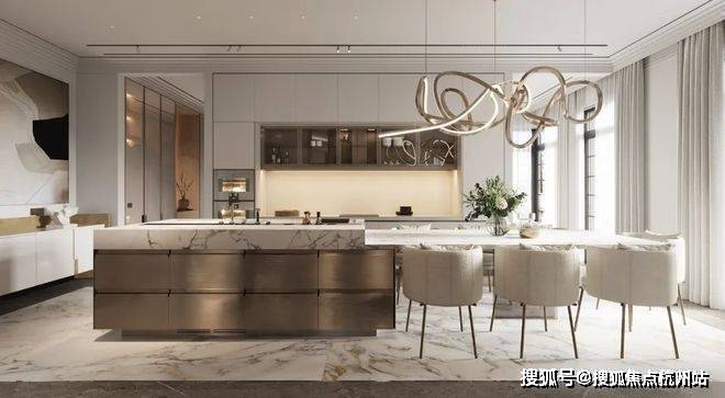上海临港未来港元启售楼处电话☎:400-8826-821【预约热线】在厨房的设计中依然沿袭客厅的设计采用大理石元素,通过金属元素与大理石元素的结合来表现空间的轻奢,其中金属的岛台加上大理石台面让空间极具氛围感,让空间看上去更有层次。