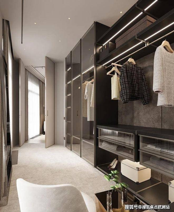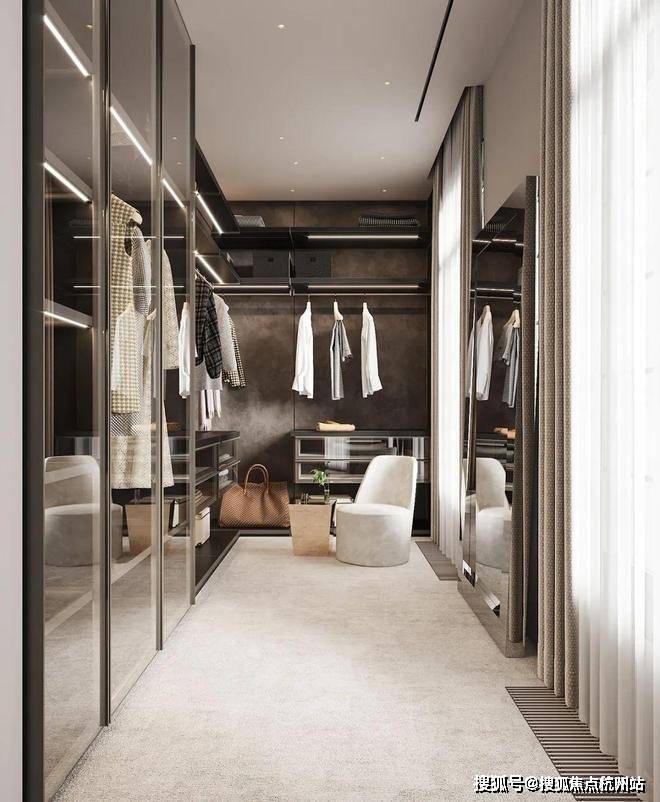 The cloakroom is independent, which facilitates the storage of clothes. The door of the cabinet is made of transparent glass, which makes the space look more atmospheric and brings convenience to the search for clothes.