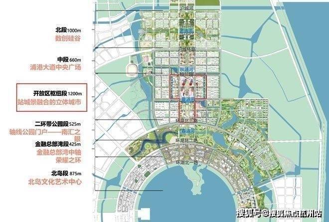 105片区以地下两港快线/地上浦港大道为中线,香柏路和乔柏路为界,形成了商办地标集群的城市中轴,中轴两侧布局住宅及相关生活配套。
