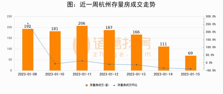 从存量房来看,2023年01月15日杭州存量房单日成交69套,比昨日减少42套,环比下降37.8%。从近一周存量房成交来看,杭州存量房日均成交套数为158套,其中01月11日成交量最高为206套,01月15日单日成交69套,低于近一周平均水平56.3%。