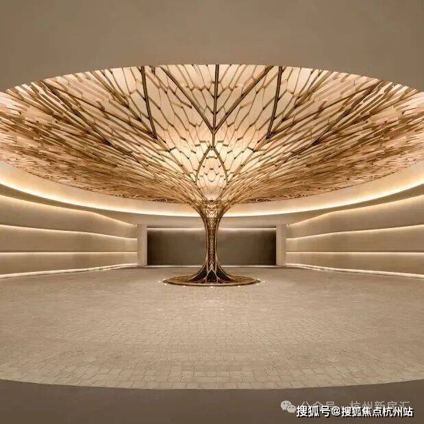 因项目整体抬高,从下沉庭院到架空层“空中花园”的落差极大,形成独特的峡谷地貌,杭序府的设计团队汲取九溪烟树为造园灵感,打造一个立体多维的城市溪谷交互园林;因项目毗邻江岸,杭序府的外立面以“站立的江潮”为灵感,