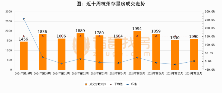 存量房方面,第28周杭州存量房成交1590套,较上周增加60套,环比上涨3.9%。从近十周成交走势来看,周均成交套数为1714套,本周低于平均水平7.2%。