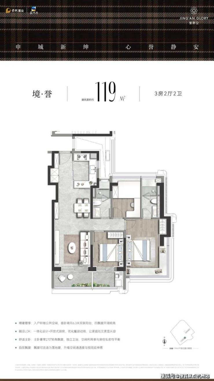 其中建面约112-119㎡高拓三房配备美诺四件套厨电、门面奢石定制等品质精工,