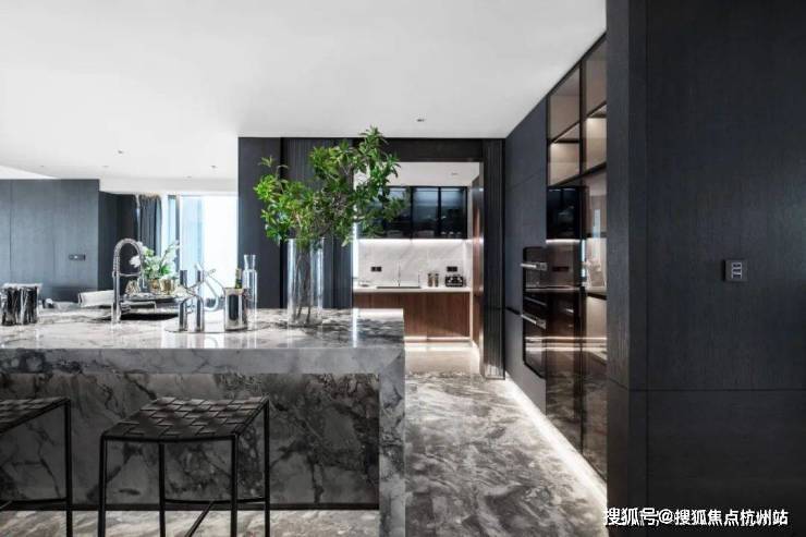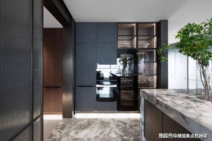 德国柏丽nobilia整体厨房,烤漆门板的选型为杭州壹号院量身定制,仿岩板色与深色木纹的搭配相得益彰,并加上柏丽的深色玻璃吊柜。定制设计中西双厨或开放式的社交厨房。巧思的细节设计,不论家庭互动还是会客聚友,都可以增加互动,社交无阻。