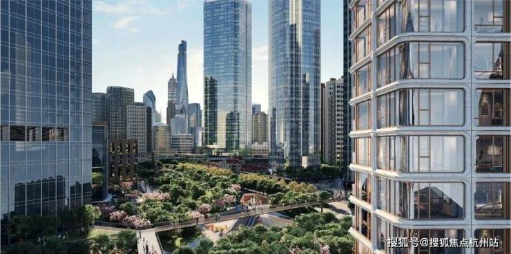 项目占据北外滩核心区一块规整且相对充裕的地块,这使绿城有空间跳出“向下拓展”的常规思路,转而将景观资源向空中延伸,打造“地面+空中+局部下沉”的三重立体游园体系。