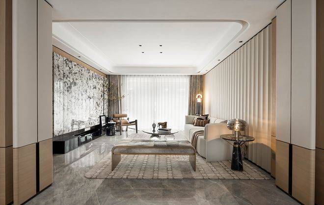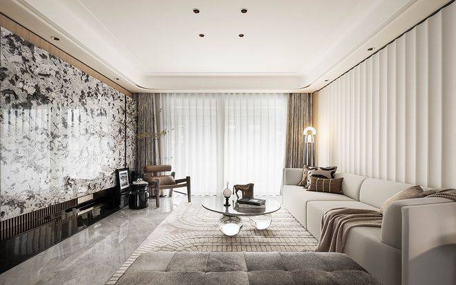 设计的主题元素来自于富春江水的气韵与形态,整体以素雅色调为主,儒雅,淡然。天然奢石“雪山飞狐”的运用,增添艺术氛围的同时,也使得视觉更具层次。