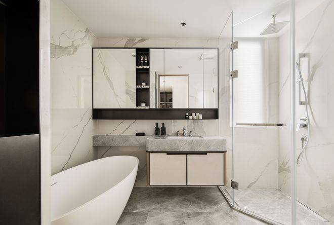 精致和实用并行,与衣帽间相对的主卫,在生活的动线内更为私密。大理石与玻璃相映,通透,舒缓。柔静的色调,身处其间,营造出纯粹宁静的心理感受。