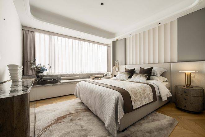主卧聚焦居住者心里层面的私密感受。将不必要的元素剔除,留下简柔色块,柔和的光线和质感细腻的材质,使整个卧室显得温馨而舒适。床前的绿植和窗边的阅读角,为居住者提供了一个放松心灵的角落。