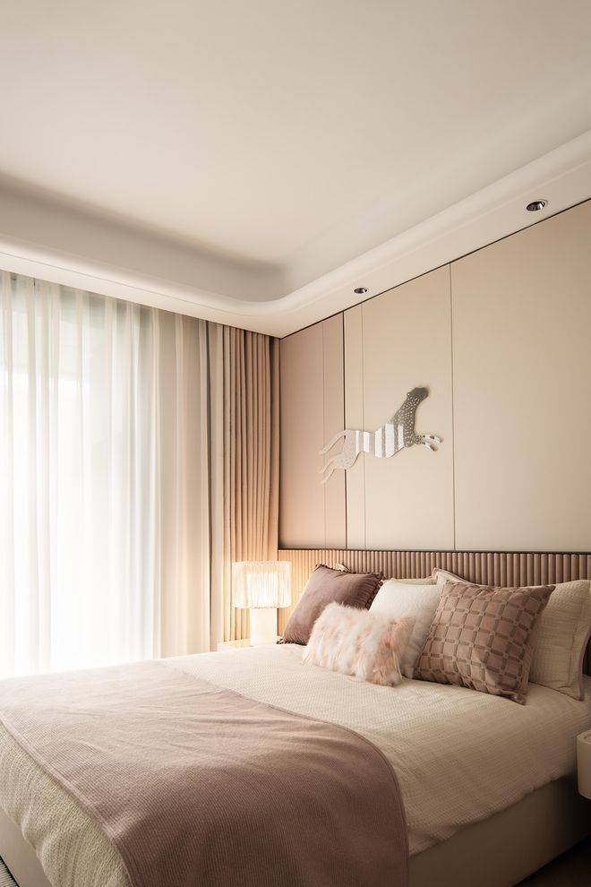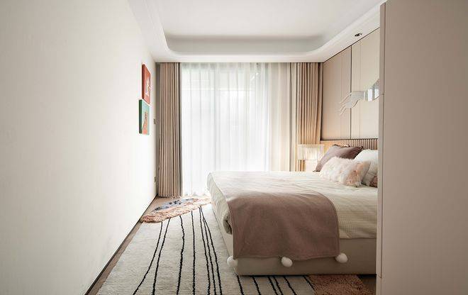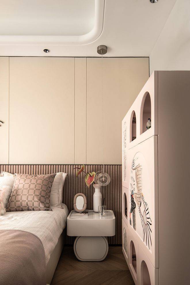 次卧与儿童房更倾向于温馨与舒怡。女孩房采用淡雅的灰粉色,材质柔软,形式圆润,细节的装饰充满童趣。
