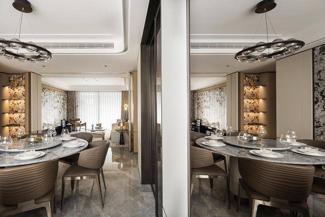 厨房玻璃平推门的半开放式设计,开合之中,是独立操作和共同享乐间的情绪转化。细节上,边台和墙面局部延续水墨纹理石材的语境,维持了家居色调统一。