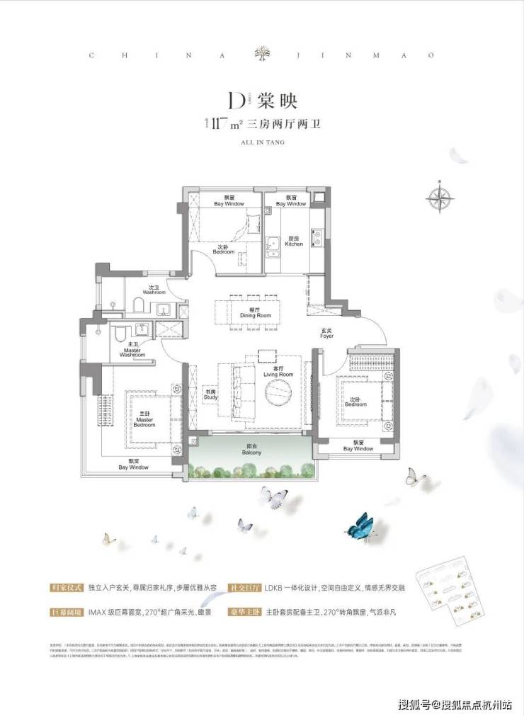 建面约117㎡3房2厅2卫,做到了3+1开间朝南+5个飘窗+主卧套房设计+270°转角飘窗,所有的尺度都有进一步提升。