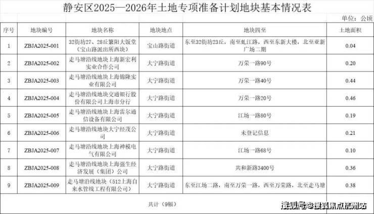 以 2025—2026年为研究范本,静安区土地储备共有9宗地块,其中8宗位于大宁,1宗位于宝山路街道。