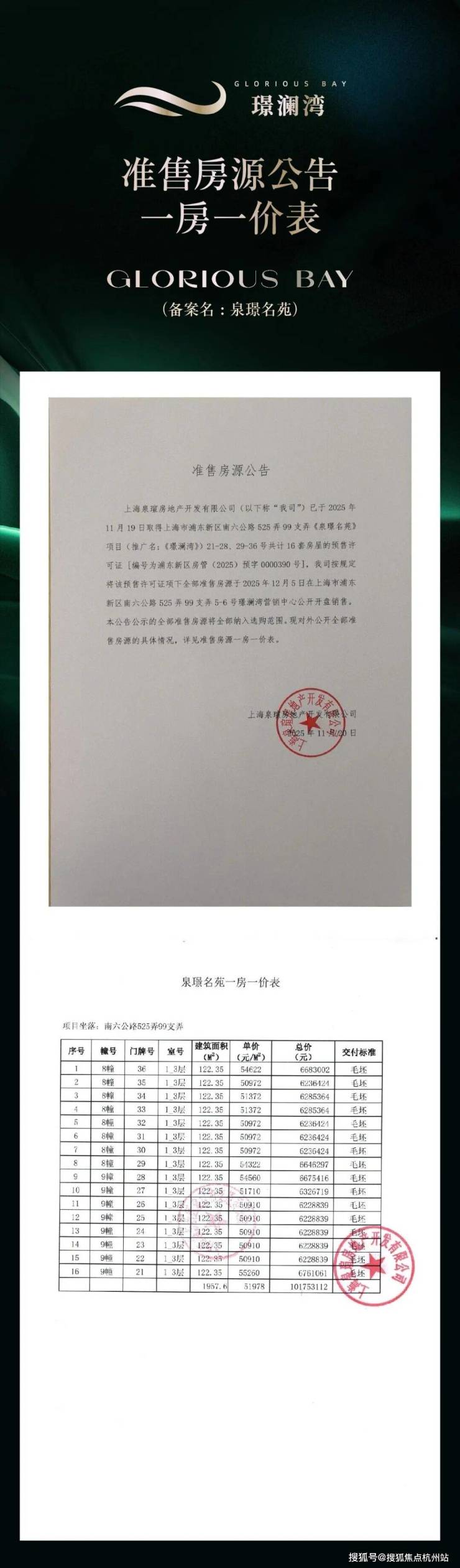 项目名称:璟澜湾(备案名:泉璟名苑)开发商:上海泉瑄房地产开发有限公司(深耕浦东,品质筑家)项目地址:上海市浦东新区宣桥镇南六公路 525 弄 99 支弄(野生动物园旁)销售状态:在售(准现房)交房时间:2026 年 10 月 30 日(实景可鉴,交付在即)规划指标: