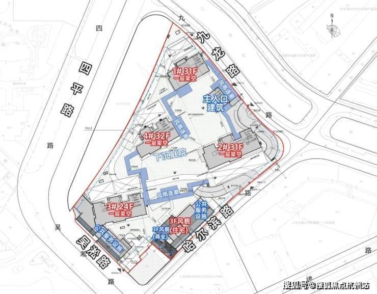 4栋住宅一层全部为架空,入口至楼栋间设置有风雨连廊。