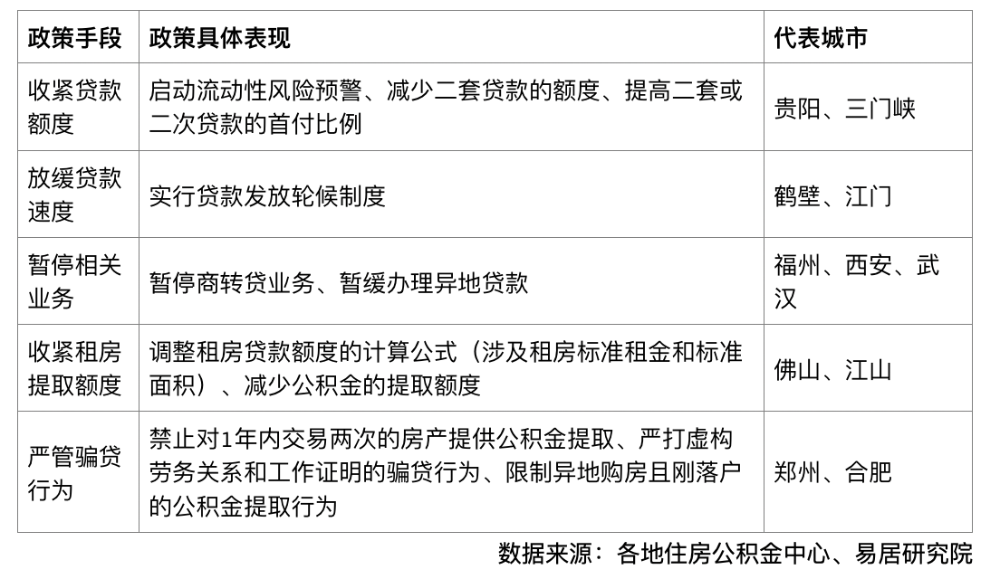 报告认为,公积金流动性不足的问题,会使得公积金的贷款出现各类压力。从公积金贷款可持续和平稳性的角度出发,公积金贷款市场确实需要积极管控和引导。近期全国部分城市纷纷收紧了公积金贷款等政策,形成了非常好的政策效应和市场预期。总结相关政策之后认为,公积金收紧的调控手段主要包括五种模式,即收紧贷款额度、放缓贷款速度、停止相关业务、收紧租房提取额度、严管骗贷行为等。