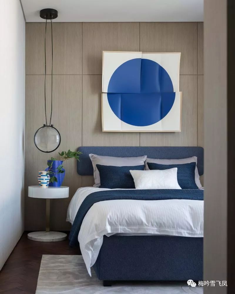蓝色卧室的 Timothy Oulton的手工制作的水晶吊灯,投射在墙面的光与影,作为空间表现的设计元素,塑造空间的另类美感。
