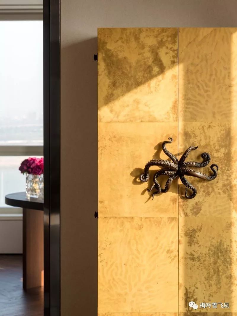 与此同时,我们回避了工业化、标准化的产品—这正是这个时代的衍生,而是选择了独特的、充满艺术性的家具——以期探索着更多自我的表达,例如 La Cividina 的几何切割扶手椅,Alexander Lamout 荷花艺术造型蜡烛架,手工研制的高柜,还有那灌注了无数个时代的匠人之心——凝聚着砂铸工艺的章鱼形把手。