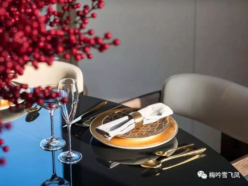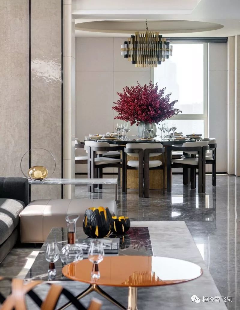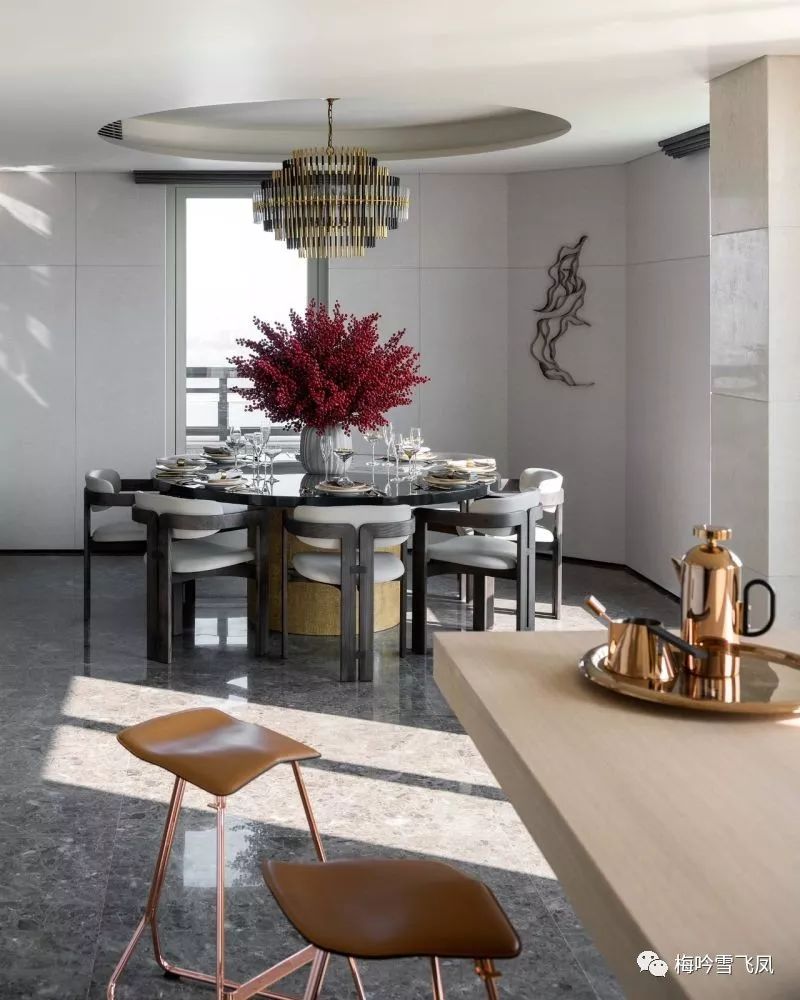「江水漾西风,江花脱晚红」朝南的江景餐厅与客厅、西厨及中厨相连通。在享受美食的同时,窗外的奢华尽收眼底。圆形餐桌带来的浑厚、黑金色带来的强烈视觉观感与向经典致敬的 Gallotti&Radice 餐椅营造的俊朗气质的搭配,融汇东西方文化。