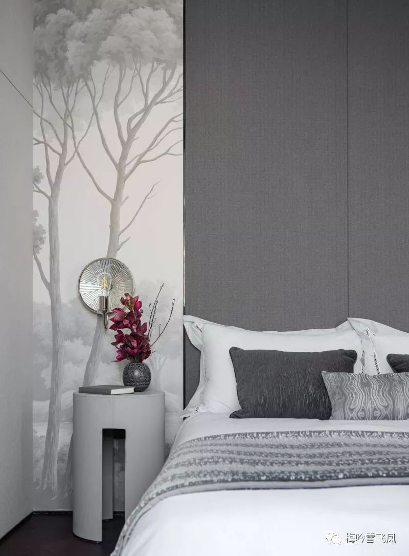 灰色卧室大胆选用写意的艺术手绘墙纸,搭配玻璃、金属与皮质的现代材质家具,自然和谐地保持着某种平衡。