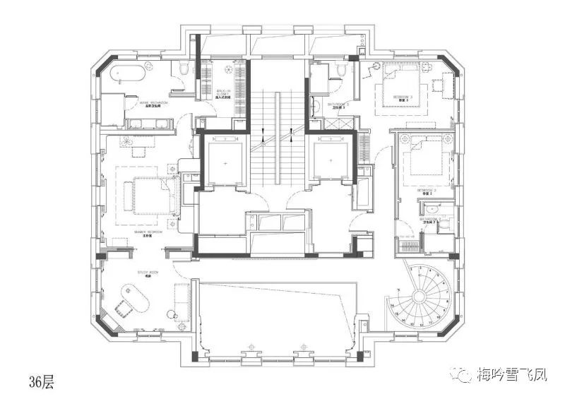 PENTHOUSE 户型共设有五房三厅两厨四卫,6 米高的挑空客厅位于南边,面朝钱塘江,旋转楼梯位于东南角,3 个空中露台依次与次卧、西厨、多功能房相连。