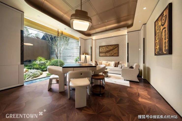 重点是作为一个整体抬高约3.7米的项目,地面层的生活馆、茶室,负一层的私宴厅、棋牌室、健身房、恒温泳池、瑜伽室,都朝向风景敞开。