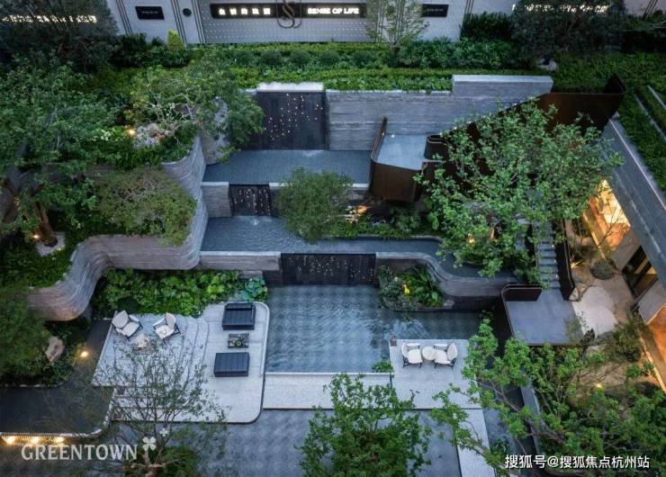 穿过小区大门后,眼前呈现一派绚烂水景,视野豁然开朗:五株婀娜香橼树在花坛中随风轻摆;叠层水幕沿着碧潭金沙、蓝眼睛花岗岩台阶潺潺流淌,营造出宁静祥和的归家心境。